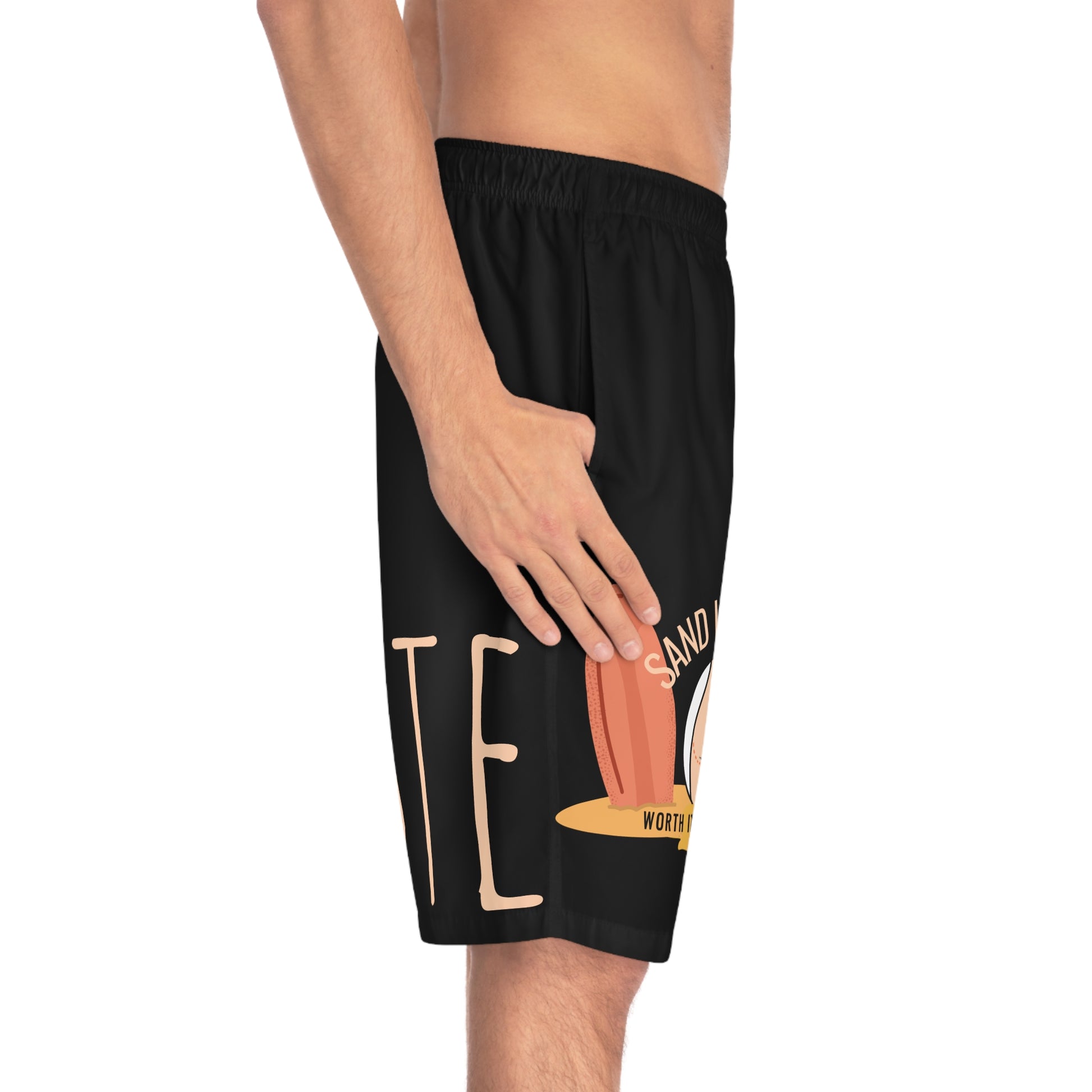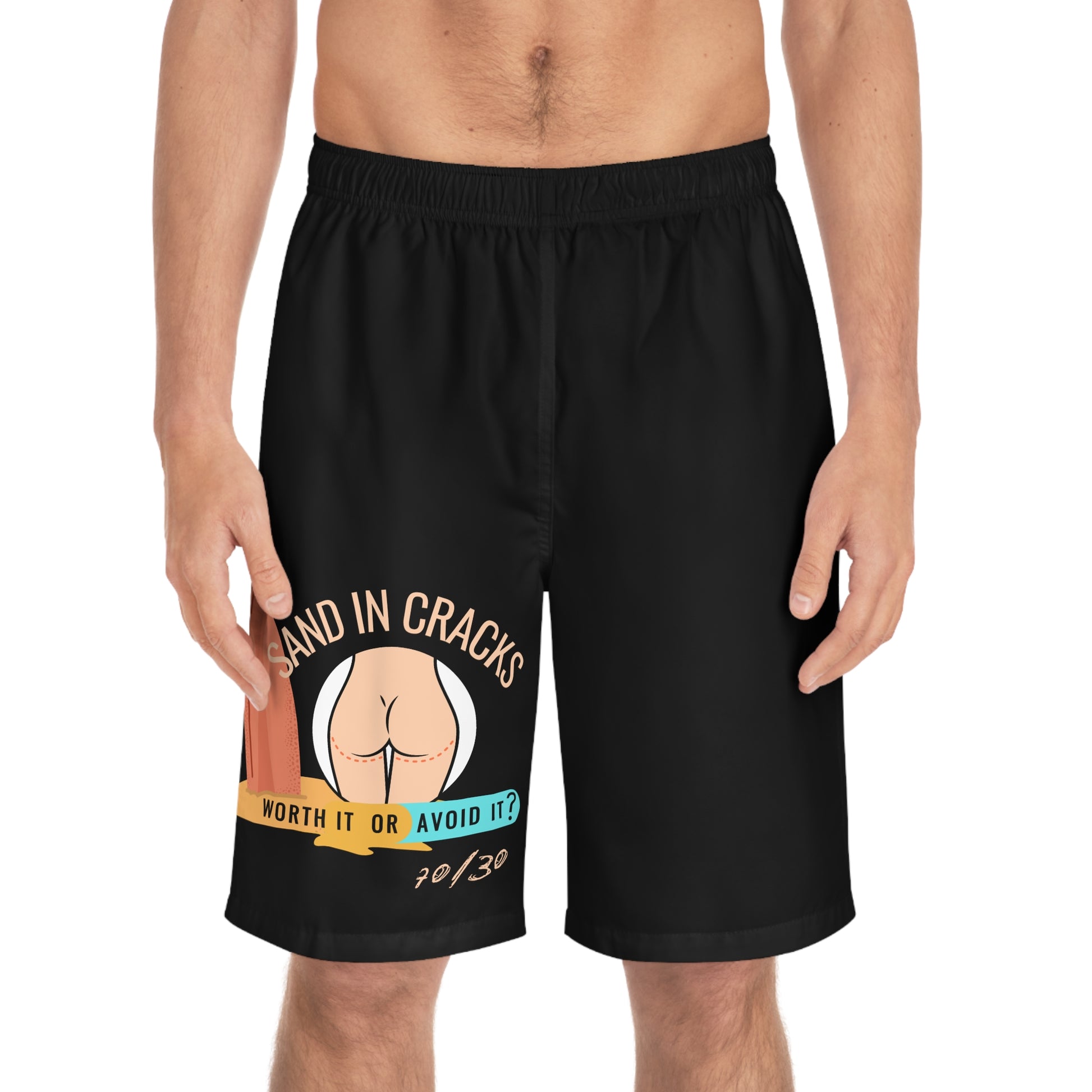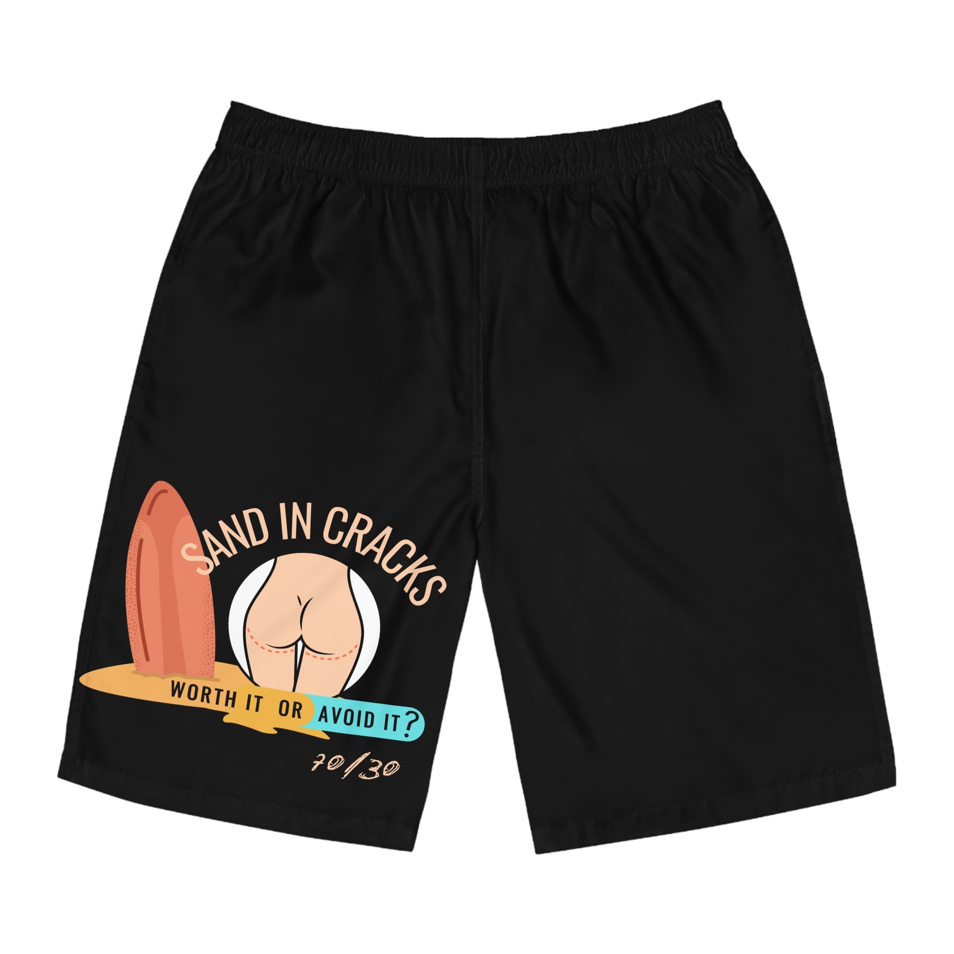 Turn heads and start conversations with our bold and cheeky “Sand in Cracks” board shorts. Featuring a playful graphic that asks the ultimate beach debate—“worth it or Avoid it?”—this design brings humor and style to your summer wardrobe.